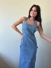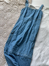 Fun versatile denim dress from the 90s with a flattering square neck chest. Zip the bottom of the dress to transition into a mini dress or zip on for a midi dress. In good vintage condition.